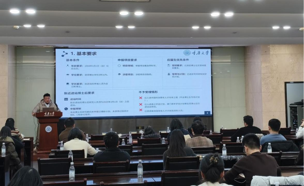 会议伊始,重庆大学人事处赵欢副处长作动员讲话。他强调,博士后队伍是学校科研创新的重要生力军,博士后科学基金不仅是个人科研起步的关键支持,更是推动学科交叉与前沿探索的重要平台。他鼓励在站博士后积极申报、提前谋划、凝练方向,学校将在政策咨询、材料审核、资源对接等方面提供全力支持。
