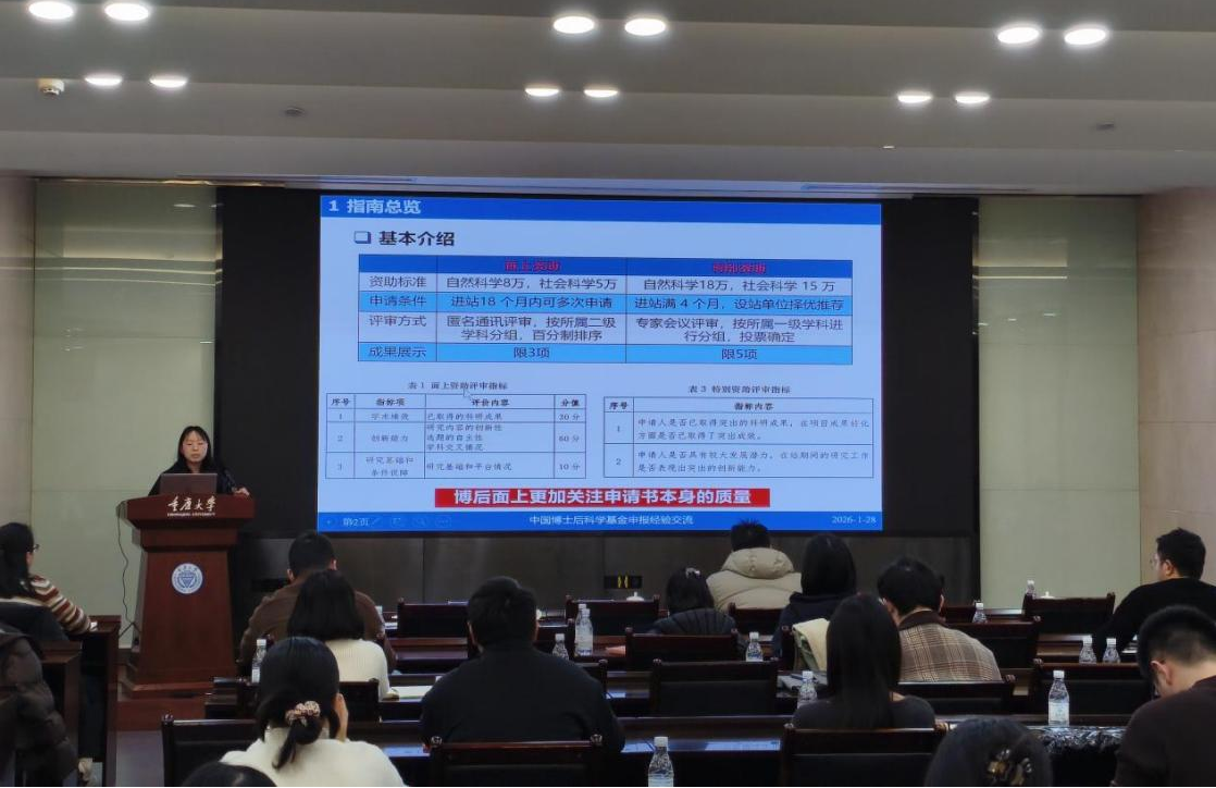为深入贯彻落实国家博士后政策,激发博士后科研创新活力,提升基金申报质量与成功率,重庆大学于2026年1月28日下午,在重庆大学A区主教学楼504室成功举办2026年度首次博士后科学基金申报动员暨分享交流会。本次活动由重庆大学人事处主办,博士后联谊会承办,吸引了校内各二级单位在站博士后踊跃参与。